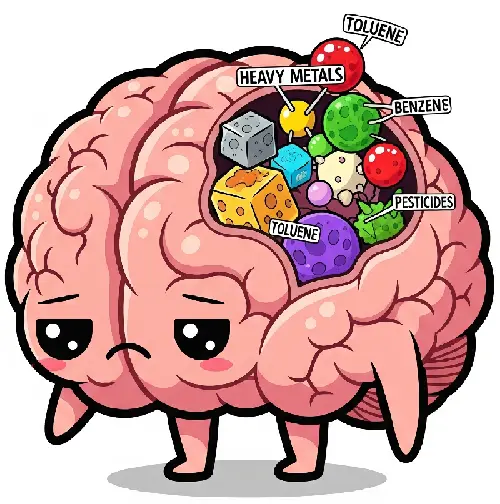 脳は脂質に富む臓器のため、水銀や鉛、農薬などの脂溶性毒素が蓄積しやすく、これらが神経に酸化ストレスを与え、可塑性を低下させます。特に水銀は神経毒性が強く、グルタミン酸受容体を過剰に刺激して神経を興奮状態にします。