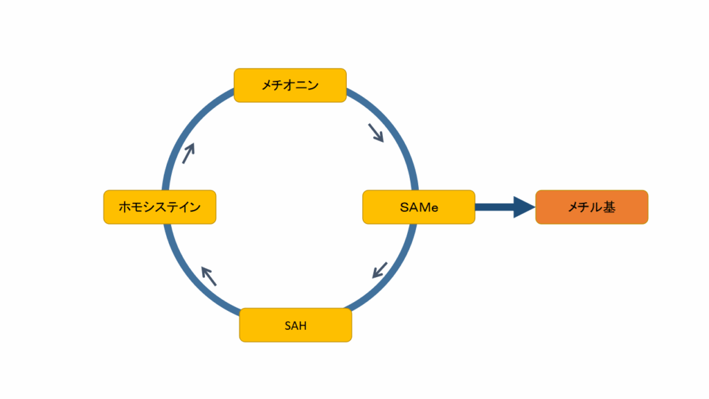 メチル化に必要な事は、食事中のタンパク質から取り入れたメチオニンが、メチオニン→SAMe→SAH→ホモシステイン→メチオニンと代謝しながらサイクルしていく事です。このサイクルの事をメチル化サイクル(メチレーションサイクル)といいます。メチル化とは、このサイクルの途中にあるSAMeに含まれるメチル基を使った化学反応です。このサイクルが滞るとメチル化も停滞してしまいます。