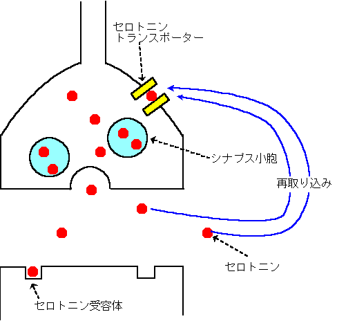 ※医師が処方するSSRI(選択的セロトニン再取り込み阻害薬)は、その名の通りセロトニンの再吸収を阻害する事によってシナプス間隙のセロトニンを増加させます。