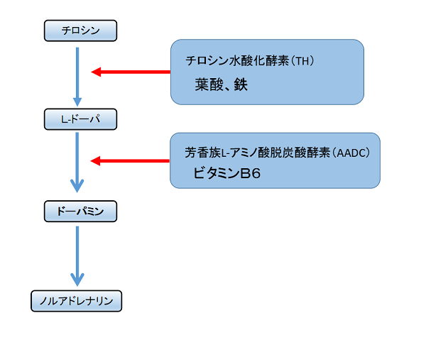 ドーパミンは、以下の図のように、チロシンからチロシン水酸化酵素(TH)、芳香族アミノ酸デカルボキシラーゼ(AADC)のによる二段階の酵素反応を経て合成されます。(さらにドーパミンからノルアドレナリンやアドレナリンへと代謝されます)チロシン水酸化酵素(TH)にはBH4という補酵素が必要です。BH4はBH2から変換されてできるのですが、その時に葉酸が必要です。BH2からBH4への変換はメチル化が十分にできている時に促進されるので、低メチル化だとドーパミンの合成が低下します。次に芳香族アミノ酸デカルボキシラーゼ(AADC)にはビタミンB6が必要です。