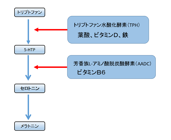 心を落ち着かせる作用のあるセロトニンは以下の図のように トリプトファンからトリプトファン水酸化酵素(TPH)、芳香族L-アミノ酸脱炭酸酵素(AADC)による二段階の酵素反応を経て合成されます。トリプトファン水酸化酵素(TPH)にはBH4という補酵素が必要です。BH4はBH2から変換されてできるのですが、その時に葉酸が必要です。BH2からBH4への変換はメチル化が十分にできている時に促進されるので、低メチル化状態だとセロトニンの合成が低下します次に芳香族L-アミノ酸脱炭酸酵素(AADC)にはビタミンB6が必要です。