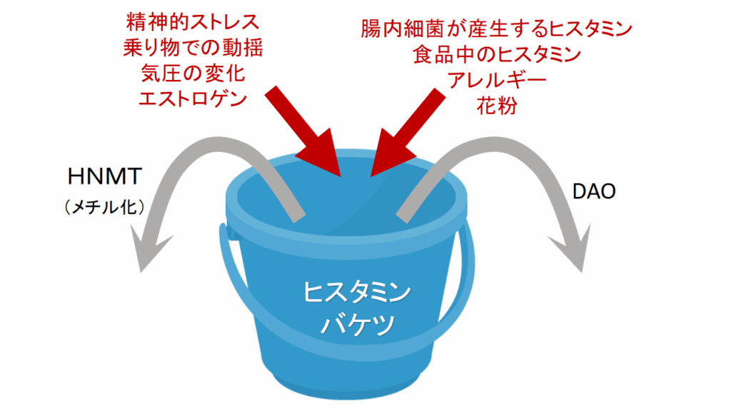 ヒスタミンを増加させる要因には、高ヒスタミン食、ストレス、腸内細菌異常、花粉やハウスダスト、アレルギー、乗り物での動揺、気圧の変化、エストロゲンなどがあります。これらの要素が複数絡み合って許容量(=ヒスタミンバケツの容量)から溢れるほどヒスタミンが増加した時にヒスタミンの症状が出るのです。食物アレルギーや季節性アレルギーがあってもヒスタミンバケツの容量に余裕があれば症状が出にくくなるでしょう。