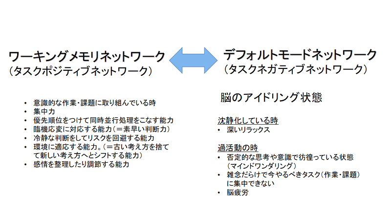 それに対し、デフォルト・モード・ネットワークとは、意識的な作業・課題に集中して取り組んでいない時の状態で、「脳のアイドリング状態」とも言えます。デフォルト・モード・ネットワークが沈静化している状態が深くリラックスしている状態です。