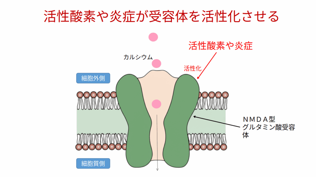 複数あるグルタミン酸の受容体の中で、代表的なNMDA型グルタミン酸受容体の感受性は炎症と活性酸素に敏感に反応して活発になるので、炎症や活性酸素対策は重要です。