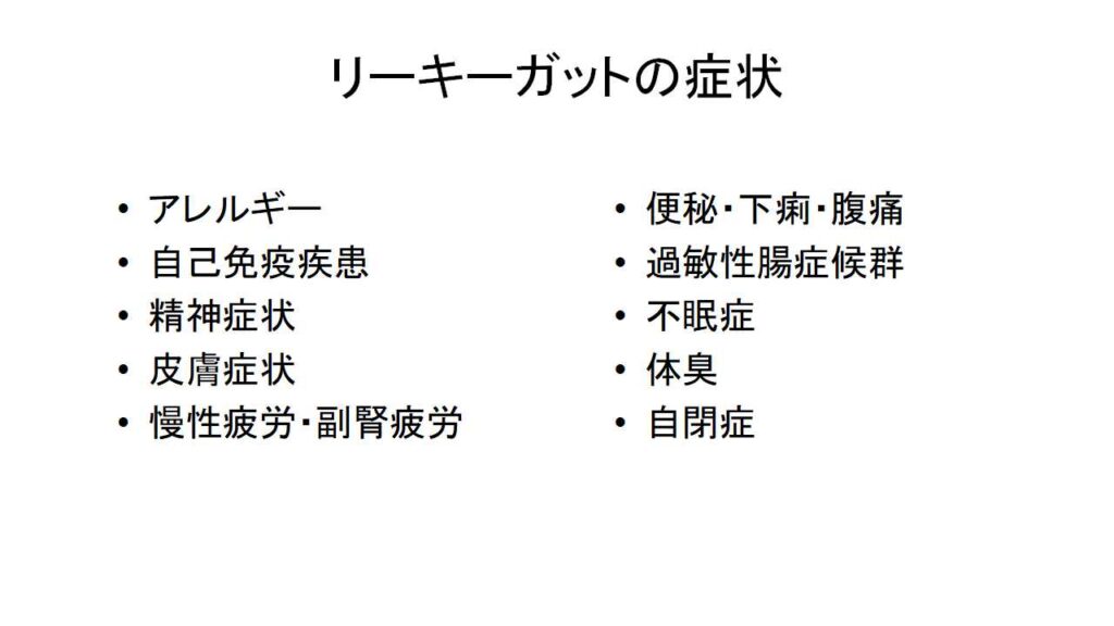 リーキーガット症候群とは、腸粘膜の障害により、正常なら腸から吸収されない未消化の食物や毒素・有害物質などが吸収され血中に入ることで様々な症状を引き起こす現象を言います。