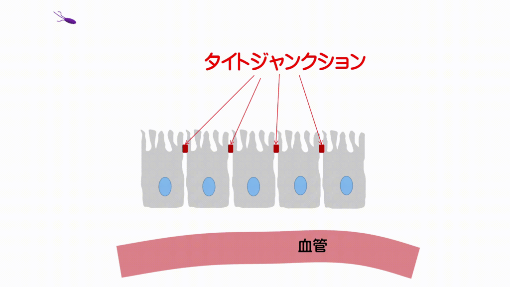 ↑タイトジャンクションが緩む事で病原体やその毒素が体内に吸収され全身性の炎症反応を誘発する