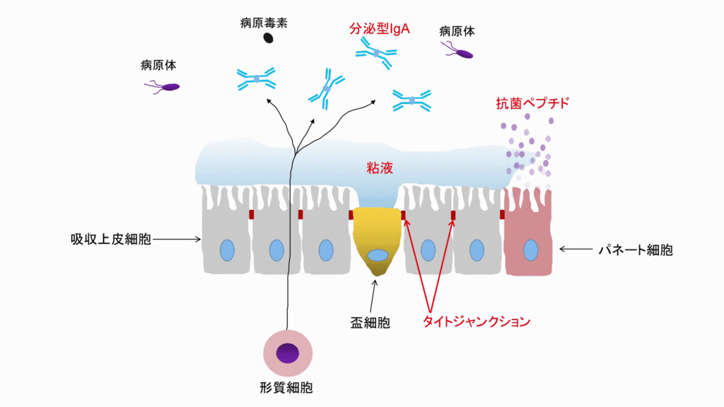 タイトジャンクションのような粘膜のバリア機能は他にもあります。まず上皮細胞の一つである杯(さかずき)細胞が分泌するムチンという粘液。それから、小腸のパネート細胞が分泌する抗菌ペプチド。そして形質細胞が分泌する分泌型IgAなどです。