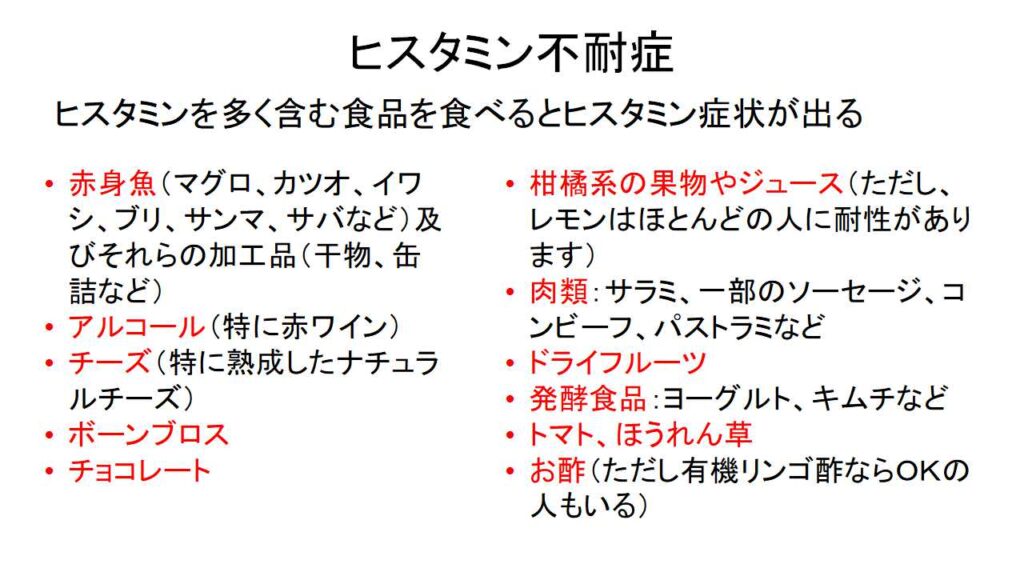 - 上皮細胞のダメージにより食物に含まれるヒスタミンを分解する酵素の分泌不足がおこり、様々なヒスタミン症状を誘発する