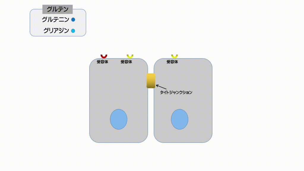 小麦のタンパク質であるグルテンは、グリアジンとグルテニンで構成されています。そのグリアジンが上皮細胞の表面にあるグリアジンの受容体にくっつくと、ゾヌリンを細胞内から細胞外を放出します。放出されたゾヌリンは今度は上皮細胞にあるゾヌリンの受容体にくっつきます。するとその信号が内部に伝わり、タイトジャンクションを緩めてしまうのです。その結果、腸管の病原体などがこのように内部に侵入するようになります。
