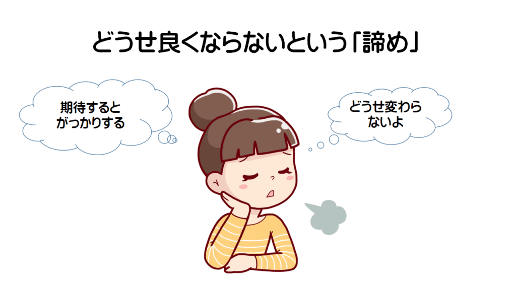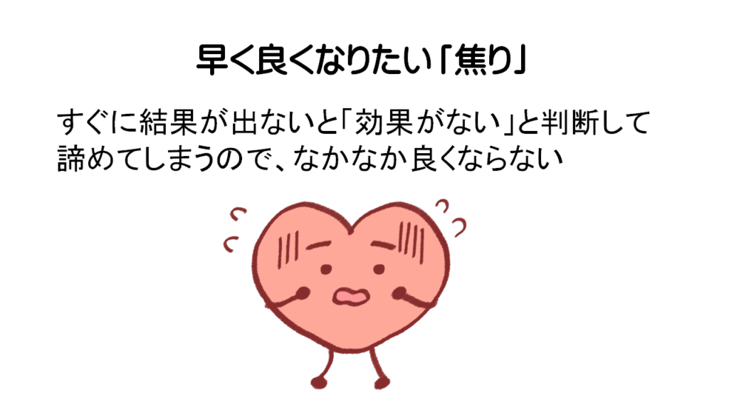 「治りたい」とか「早く良くなりたい」と思うと「どうせ良くならない」という「諦め」の気持ちが出てくる人もいます。このような方は、期待しすぎると、もし駄目だった場合に、酷くがっかりして傷ついてしまうから期待しないようにしているのかもしれません。しかし、諦めの気持ちが強いと、ちょっとやっただけで「やっぱり駄目だ」とセラピーを打ち切ってしまうので、何をやっても良くならないでしょう。
