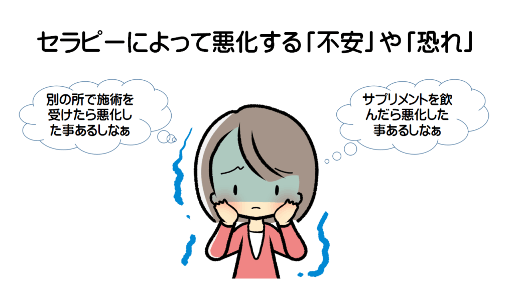 今までにセラピーによって悪化した事がある人は、「治りたい」とか「早く良くなりたい」と思うと、悪化するんじゃないかという恐れが出てくる人もいます。このような方は、その恐れがが原因でほんとに悪化しやすいタイプです。また、悪化するより現状維持のほうがまだマシだとばかりに、現状維持に留まろうとするので、セラピーをすぐに中止してしまう傾向があります。