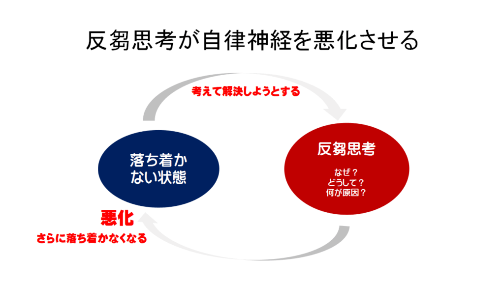 そして不安を解消するために、「なぜ?」「どうして?」「何が原因?」などととあれこれ思考し続ける反芻思考に陥る人が多いです。そうやって自分自身に説明して納得したがっているのです。しかし、落ち着いていない状態であれこれ思考すると、その思考が逆に火に油を注ぐ結果となり、ますます落ち着かなくなるという状態になります。そして、そういった反芻思考が脳疲労をおこし回復を妨げてしまいます。また、落ち着かない状態で考えると認知の歪みがおこりやすくなります。この人たちに必要な事は問題解決を棚上げにし、まずは今ここを感じて落ち着くという事です。