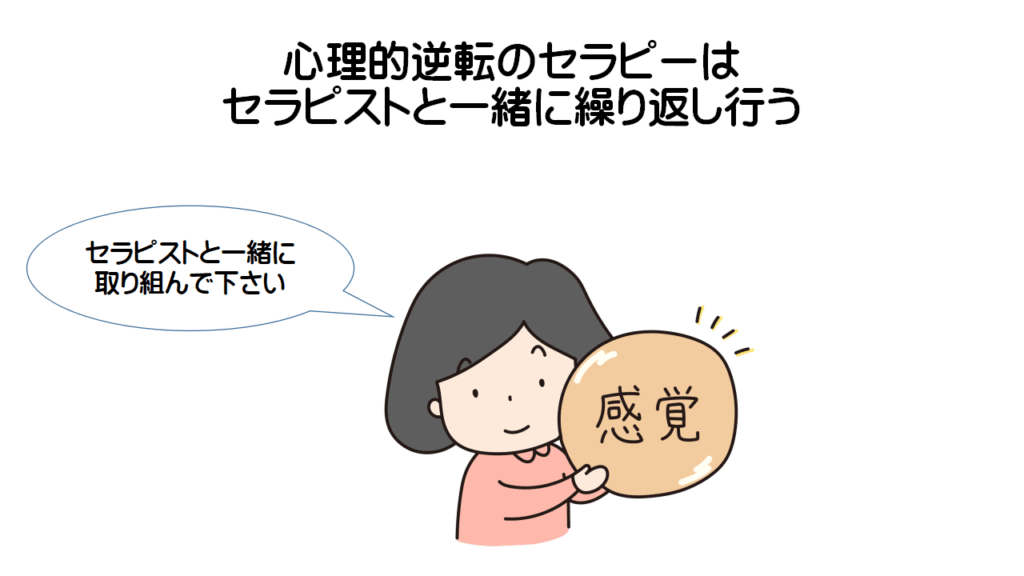 それから、心理的逆転は1回のセラピーで解消できたとしても、それは一時的な効果です。しばらくするとまた心理的逆転が出てくるのが普通なので、継続的に行う必要があります。また、心理的逆転はセルフケアの範囲でもできる簡単な方法もありますが、多くの場合、セラピストと一緒に心理療法を繰り返し行う必要があります。特に被害者意識や罪悪感は、そう簡単には癒やされないので、かなり長期間かかるでしょう。