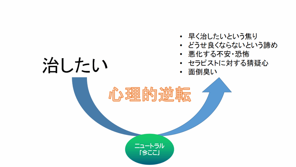 私の場合、心理的逆転の反応が出たクライアントに、「この中で思い当たるのはありませんか?」と尋ねていますが、だいたいの方が、この中に思い当たるものがあります。一番、多いのは、なかなか良くならない現状に対する「焦り」と原因や解決法がわからない「不安」でしょうか。しかし、たまにですが、何も思い当たる事がなく、何が原因で心理的逆転が起こっているのかが全くわからない人もいます。