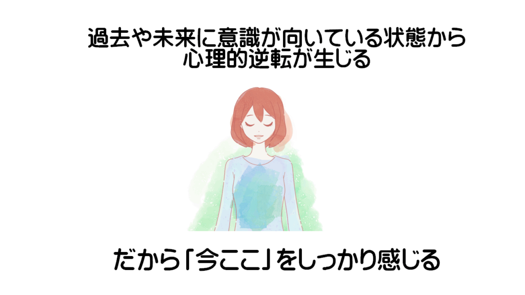 信頼関係構築ができたら、次に「今ここ」をしっかり感じてもらうように私がガイドします。例えば、なかなか良くならない現状に対する「焦り」なんて、未来に意識がいっている状態ですし、恨みや罪悪感は過去に意識がいっている状態ですよね。このように、心理的逆転の原因は、過去や未来に意識が向いている状態から生じているので、「今ここ」をしっかり感じるだけでも心理的逆転が解消する事がよくあります。