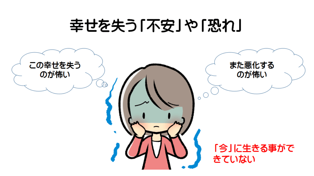 また、幸せを感じると幸せを失う不安が出てくる人や、病気が良くなってくると病気がぶり返す不安が出てくる人もいます。このパターンも広汎性の心理的逆転がおこります。ちなみに、スターウォーズに出てくるダースベイダーがダークサイドに落ちてしまった原因は、大切な人を失う不安や恐怖でしたが、これも幸せを失う不安です。このような不安の原因としては、未来にばかり意識が向いていて、今に意識を向ける事ができないという事や、幸せである事や健康である事に慣れていないという事が考えられます。今ここに意識を向ける練習をする事や、早く良くなろうとせず、良くなるスピードをスローダウンさせて体や心の変化を整理統合させる時間をたっぷり与えるという事が重要になってきます。