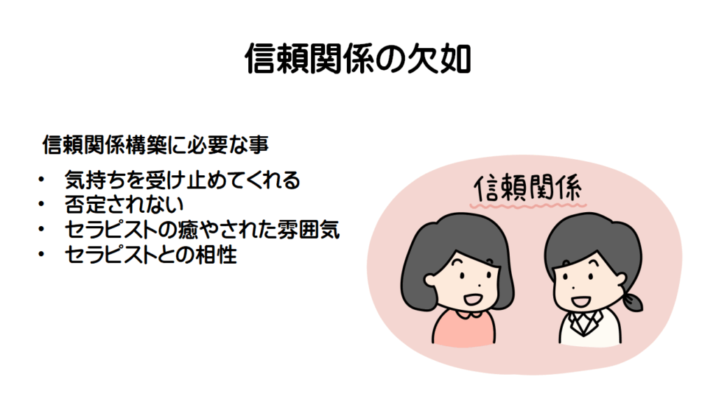 また、セラピストとクライアントの間に信頼関係が築けていない場合にも心理的逆転がおこります。この場合の心理的逆転は「この人には治してもらいたくない」というセラピストに対する拒否反応とも言えるでしょう。例えば、セラピストが自分の話をしっかり聞いてくれないとか、話は聞いてくれるけど否定されたりして理解してもらえないとか、なんとなくセラピストの雰囲気が苦手とか、そういう事が信頼関係が築けない原因です。しかし、どんなに素晴らしいセラピストであってもクライアントとの相性が悪い場合がありますし、クライアントの中には猜疑性パーソナリティ障害のように猜疑心が異常に強い人もいて、どんな人とも信頼関係を築けない場合もありますので、必ずしもセラピストに問題がある訳ではありません。