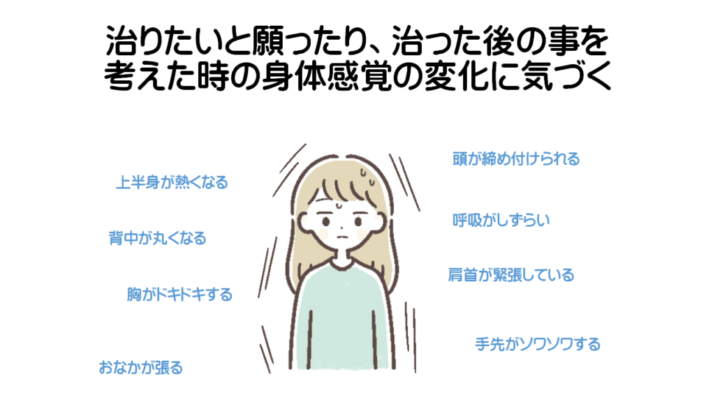 その場合は、治りたいと願ったり、治った後の事を考えた時の身体感覚の変化を探してもらいます。そうすると、何故か不安などの気持ちが出てきたり、胸がドキドキするとか、頭が締め付けられるとか、手足がソワソワするなどの、なんとなく落ち着かない身体感覚が出てきます。その場合は、やっぱり心理的逆転があるね、という事になります。特に疾病利得の人は、治った後の事、例えば、学校や仕事に行く事などを考えると、ネガティブな感情や落ち着かない身体感覚がでてくるでしょう。