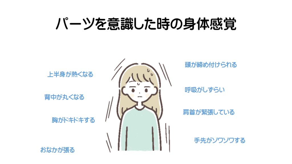 もう一つの方法として、治りたくないパーツや焦っているパーツなどを意識した時の身体感覚に意識を向けるという方法があります。例えば、胸が苦しくなるとか、頭が締め付けられるとか、手先足先がそわそわするとか、そういった落ち着かない身体感覚に好奇心を向けていくセラピーです。この方法は自分でもできそうに思われるかもしれませんが、実はとても難しいので、必ずセラピストと一緒に行う必要があります。