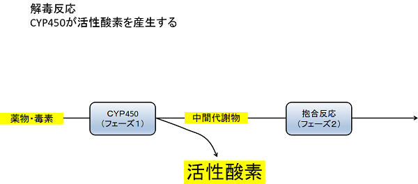 フェーズ1はシトクロームP450(CYP450)という酵素群が働いているのですが、この酵素は副産物として活性酸素を産生します。
