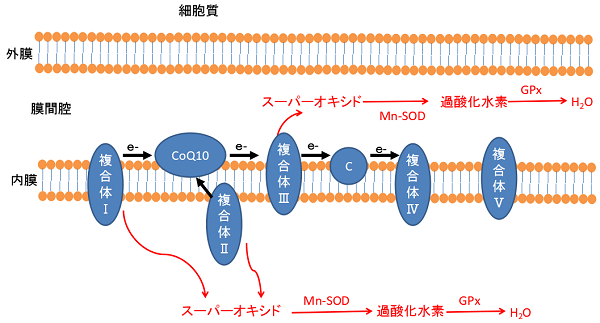 特にATP合成の最終段階である電子伝達系の複合体Ⅰと複合体Ⅲという部分で活性酸素が発生します。複合体Ⅰと複合体Ⅲで発生した活性酸素はSODとグルタチオンペルオキシダーゼという酵素によって代謝される必要があります。