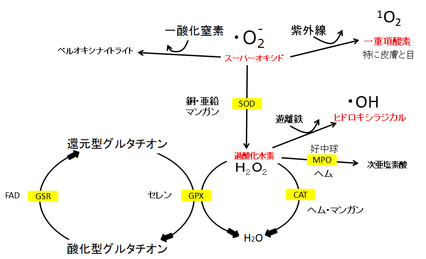 スーパーオキシドはSOD(スーパーオキシドジスムターゼ)という酵素によって代謝されるので、SODの酵素活性を高めるために酵素の補因子であるマンガン・亜鉛・銅などのミネラルが必要かもしれません。なお遺伝子多型によってSODの酵素活性が低い人もいます。またSODは糖化反応(メイラード反応)によって活性が著しく低下することから糖尿病患者は活性が低下しています。
