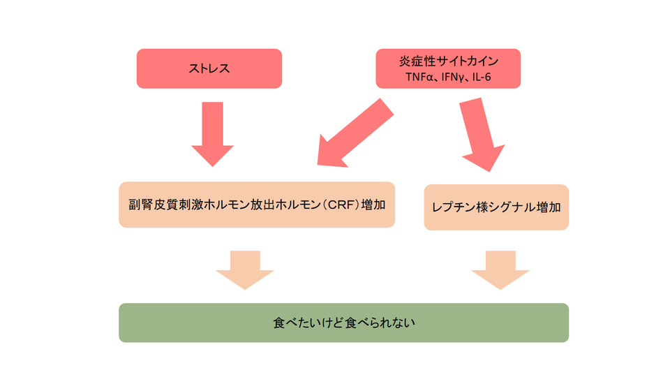 また食欲を抑制するホルモンに脂肪細胞が分泌するレプチンがあります。通常、痩せて脂肪細胞が小さくなるとレプチンの分泌が低下し食欲が出てきますが、炎症があるとレプチン様シグナルというのが増加するため食欲が抑制され、「食べたくても食べられない」という状態になります。