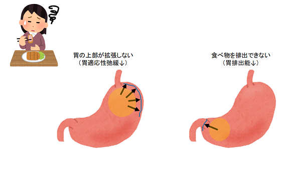 機能性ディスペプシアの人は、胃適応性弛緩に問題があり、食事をしても胃の上部が拡張しないため、少食にしないと膨満感で苦しくなったり、ムカムカして気持ち悪くなります。また胃から十二指腸へ食べ物を排出するスピード(胃排出能))も通常より遅いため胃の中に食べ物が滞留する時間が長くなる事も関係しています。さらに胃が知覚過敏の状態に陥っていることで正常な胃酸分泌でも灼熱感、痛みやなど引き起こします。(逆流性食道炎の症状と同じですね)