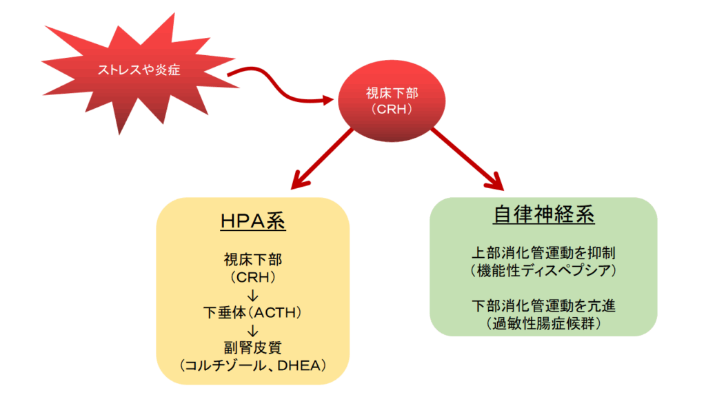 機能性ディスペプシアの大きな原因はストレスと炎症です。ストレスや炎症があると脳の視床下部からCRH(副腎皮質刺激ホルモン放出ホルモン)が出て下垂体を刺激します。刺激された下垂体は副腎皮質を刺激します。このようにして抗ストレス作用や抗炎症作用があるコルチゾールの分泌を刺激しています。